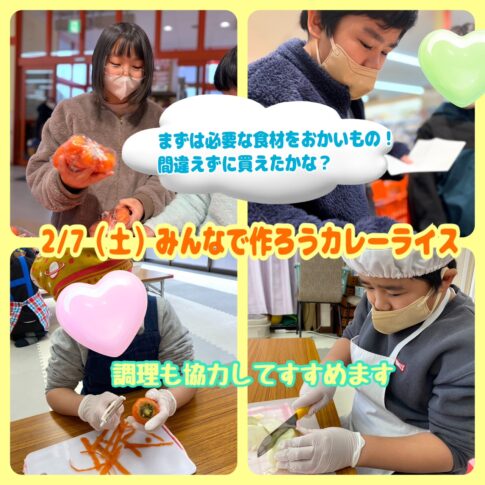 この日はカレーライスづくり☆3種類のルーを使いました。ルーの種類に合わせて、3チームで買い物から調理を進めていきます。食材の量も考えながら買い物をしていきます。 にんじん、じゃがいも、たまねぎ、お肉それぞれ皮むきや切り方...
