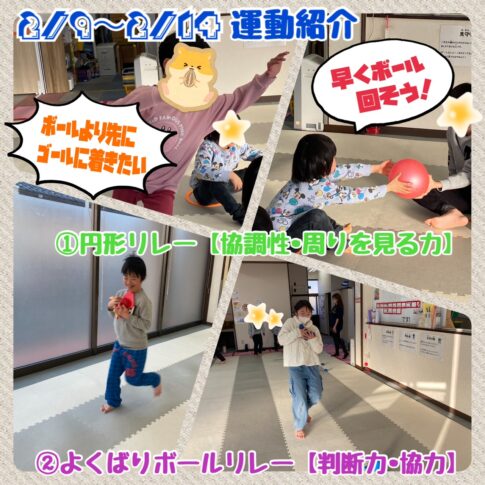 ①円形リレー 【協調性・周りを見る力】円の形で座り、座っているお友達はボールを回していきます。立っているお友達は座っている組がボールを回し終える前に円を一周回り切ります。さあ、どっちが勝ったでしょう? ②よくばりボールリ...